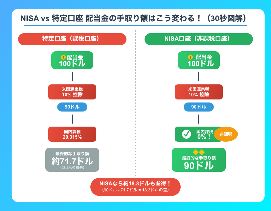 特定口座であれば、米国で課税された10%分を「外国税額控除」で一部取り戻せますが、NISAではこの制度が使えません。